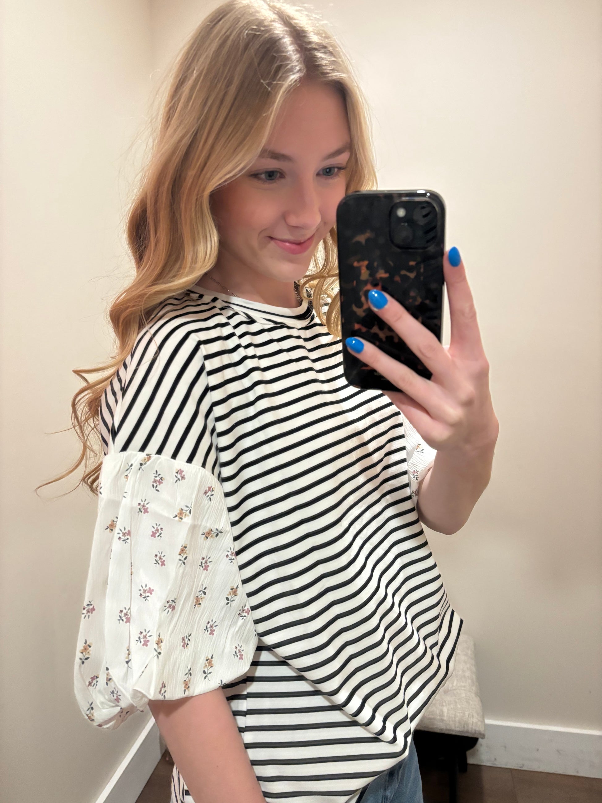 A perfect blend of classic and feminine, the Bloom & Stripe Mixed Media Top adds an elevated twist to your everyday look. Featuring timeless black-and-white stripes through the body paired with soft floral contrast sleeves, this top offers a relaxed fit with eye-catching detail. Lightweight and comfortable, it’s easy to style with denim for a casual day out or dressed up with accessories for a polished finish. A unique staple that brings charm and versatility to your wardrobe.