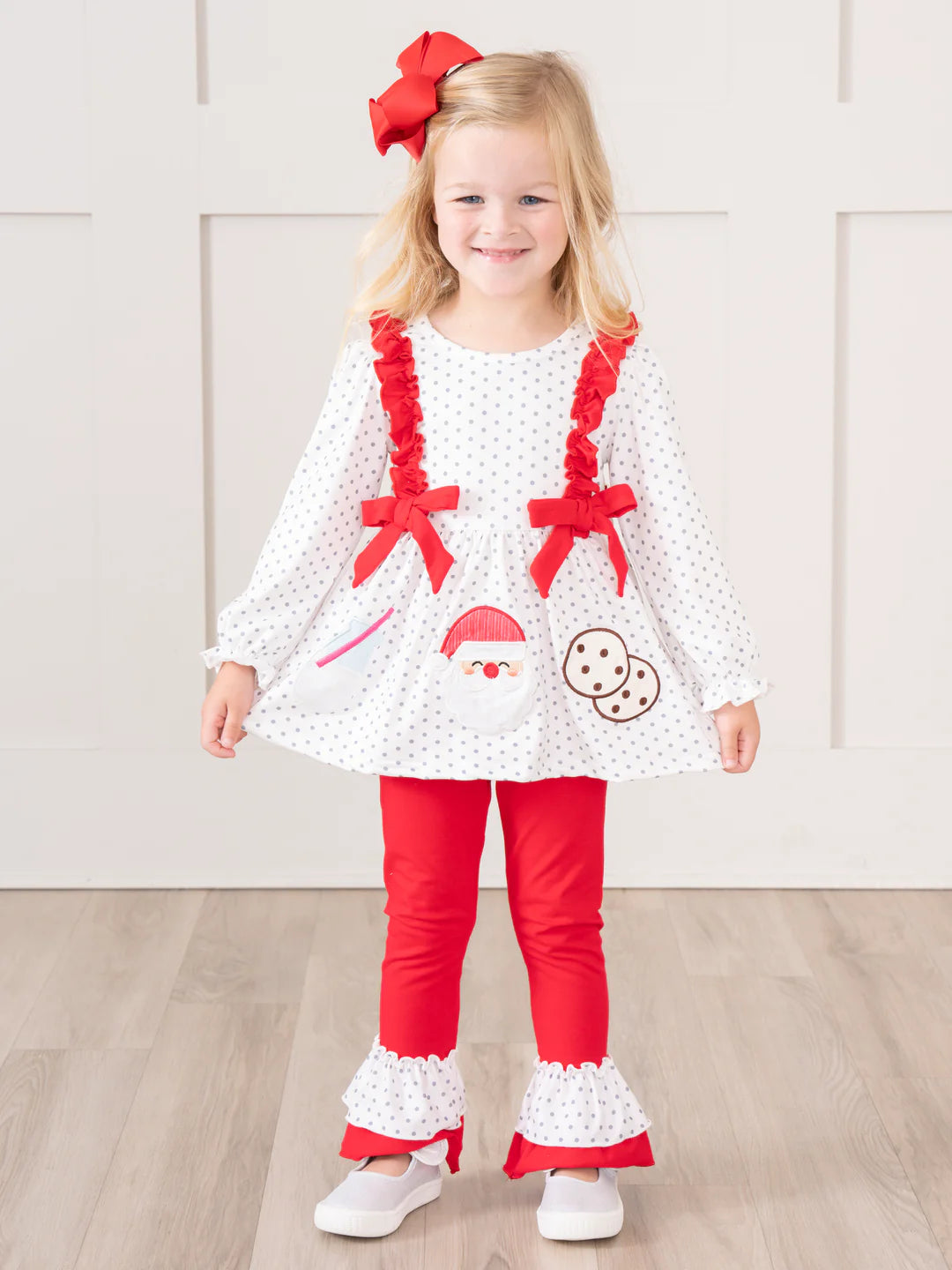 Get ready for some festive fun with our Embroidered Santa's Milk & Cookies Ruffle Outfit! This adorable girls' outfit features a playful polka dot top, accented with a ruffle and bow for extra flair.