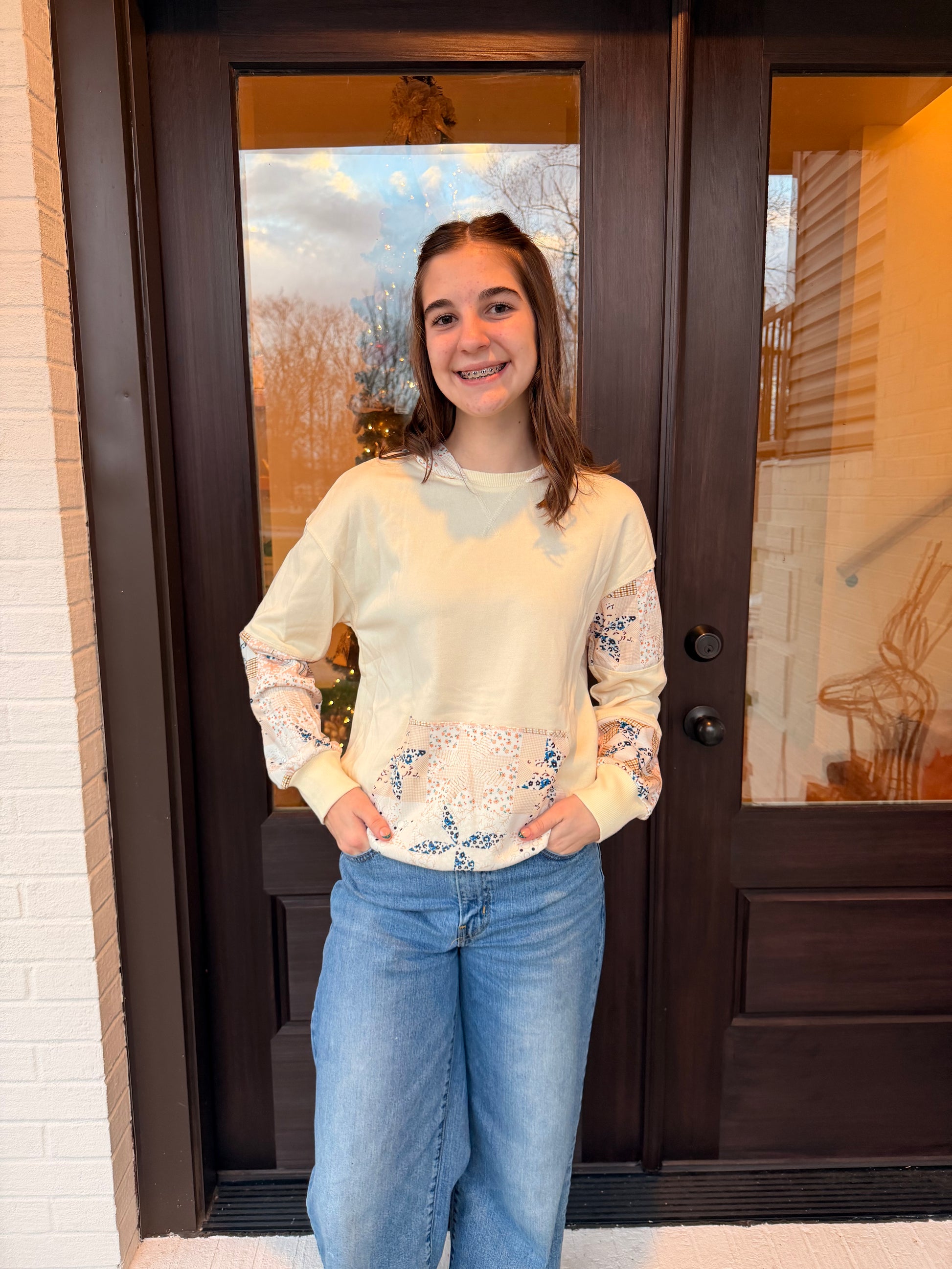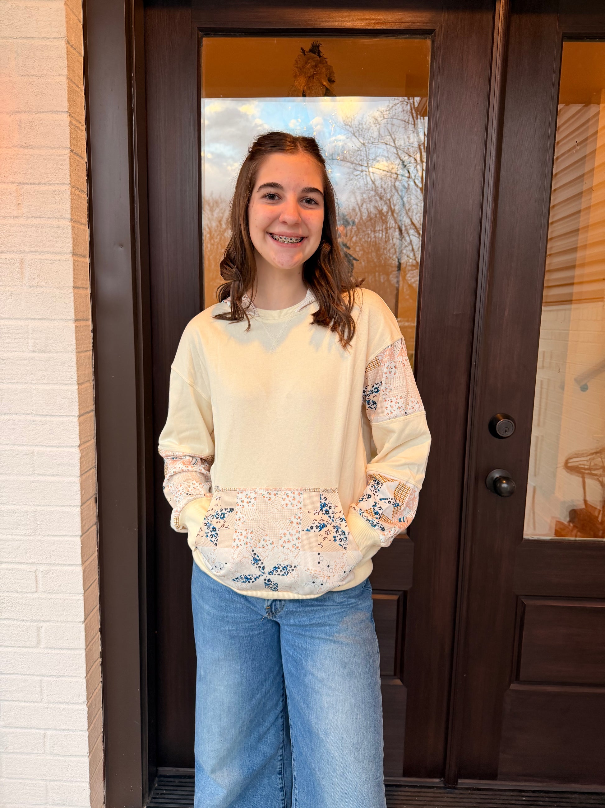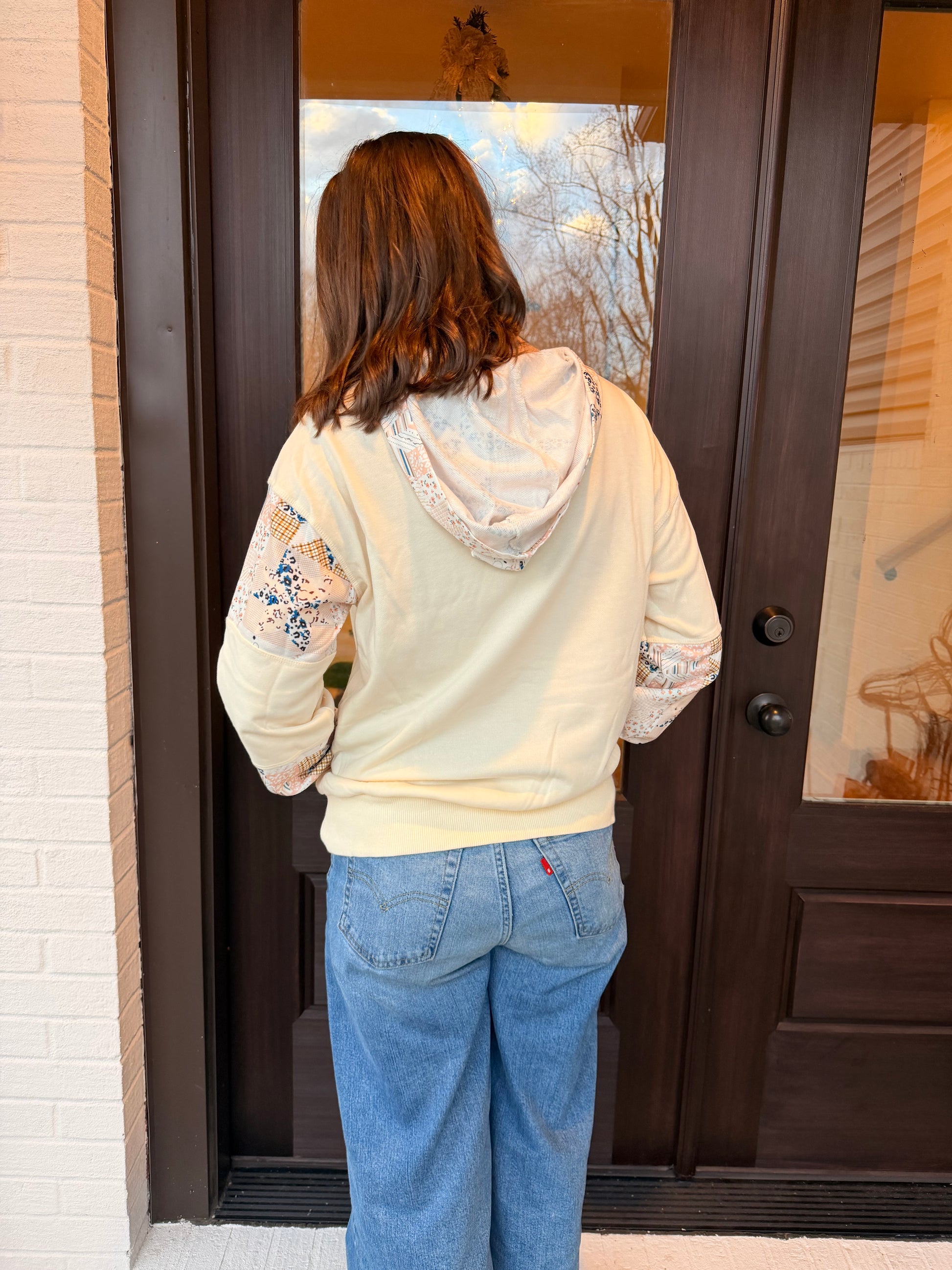 Soft, sweet, and winter-ready. The Patchwork Snowfall Hoodie brings a cozy twist to your Winter Blush Collection. This cream hoodie features quilt-inspired patchwork detailing along the sleeves, hood, and front pocket in shades of blush, navy, and golden plaid. The relaxed fit and lightweight fleece feel make it perfect for chilly days, errands, or lounging in style. A feminine, winter-warm piece that stands out with its delicate patterning and soft neutral tones.