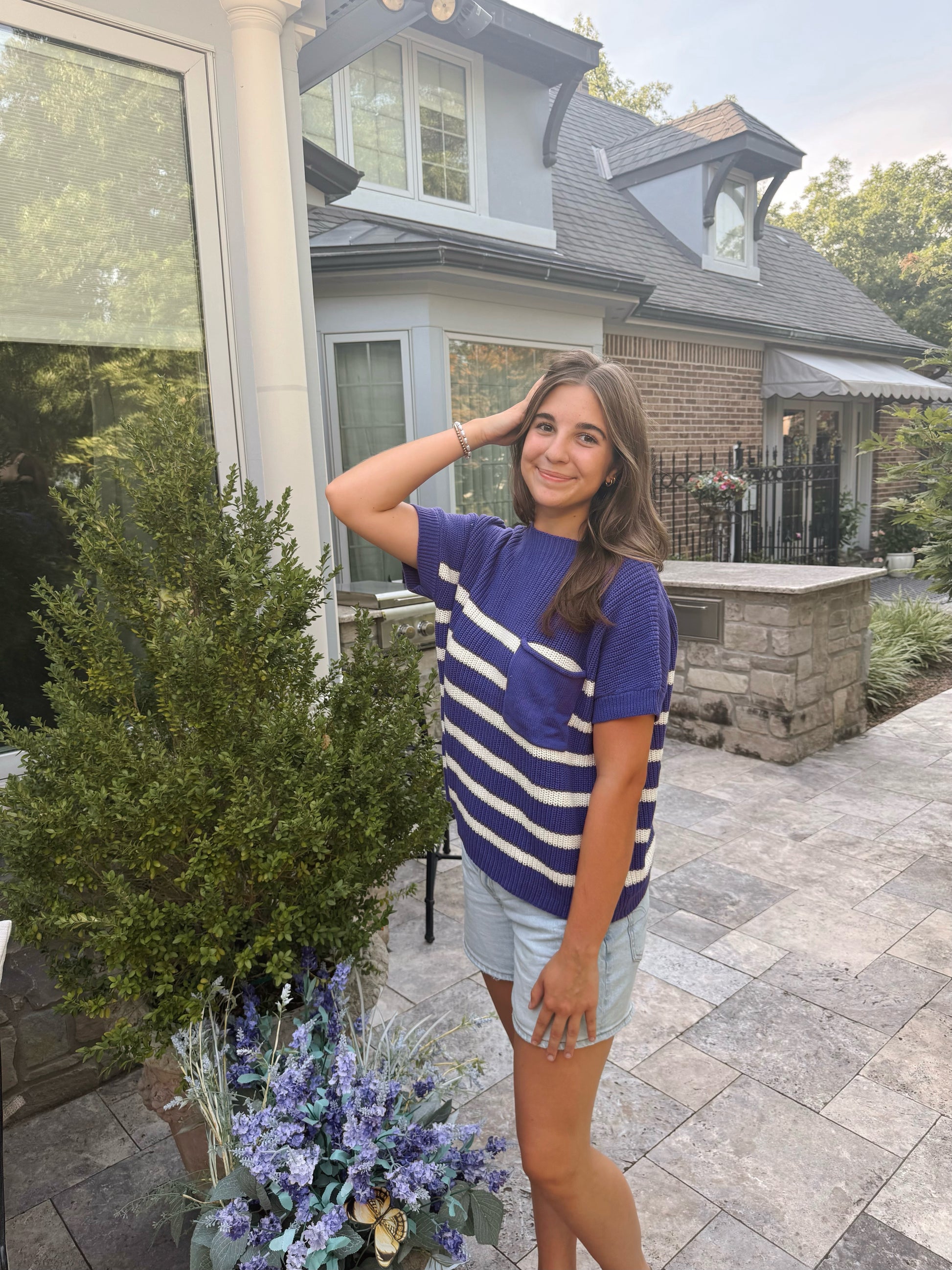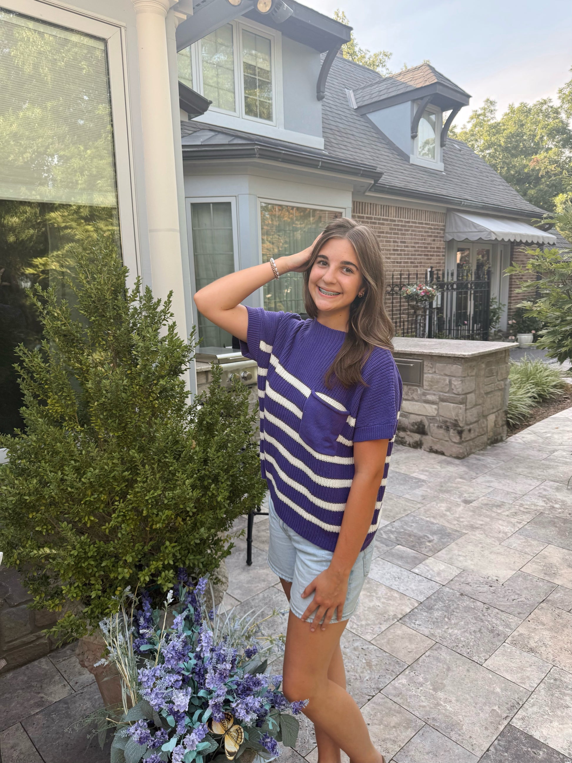 Show your spirit in style with the Purple Pride Sweater! This drop shoulder, short sleeve striped knit is the perfect lightweight layer to take you from class to game day. With bold purple and white stripes and a fun front pocket detail, it’s comfy, casual, and full of school pride.