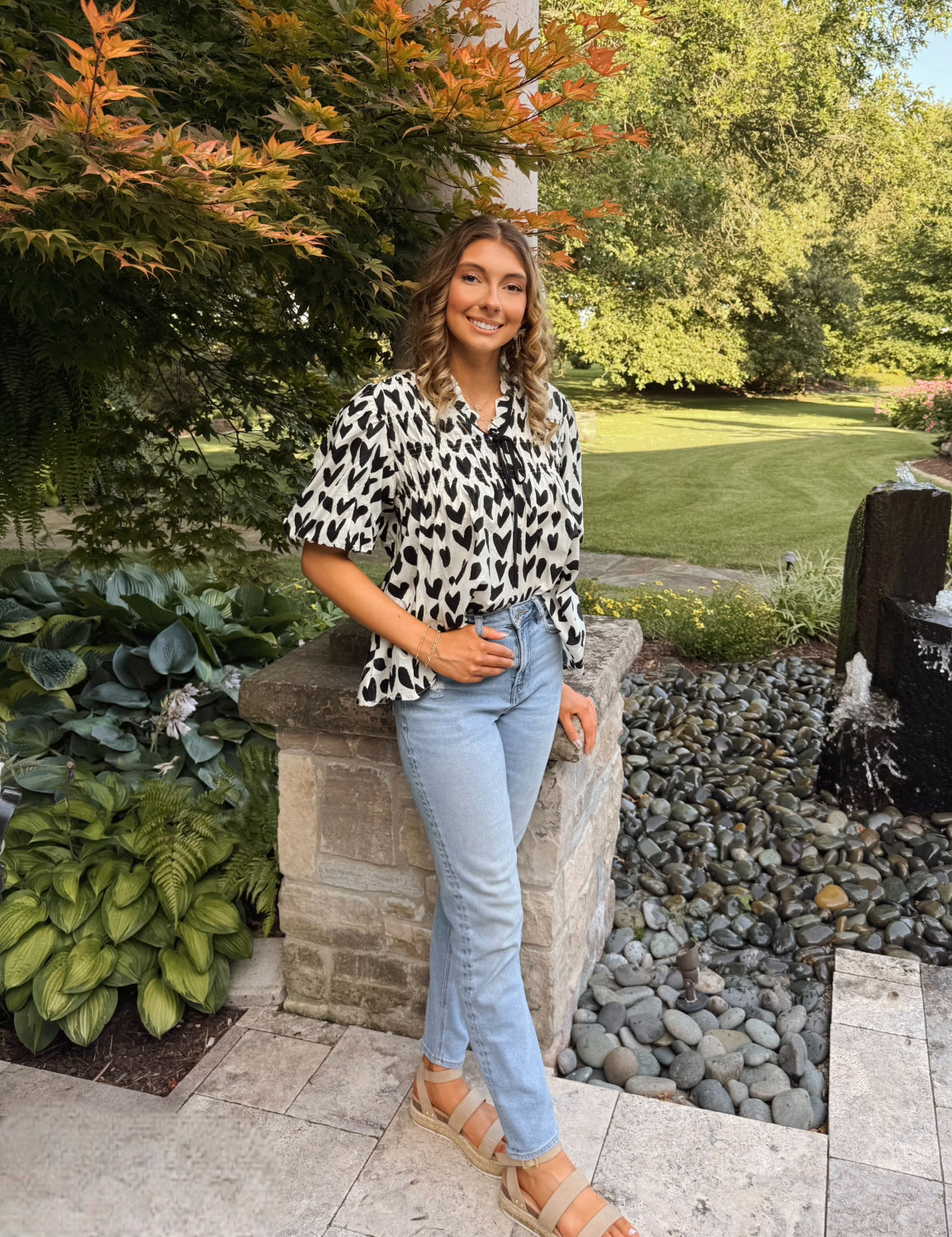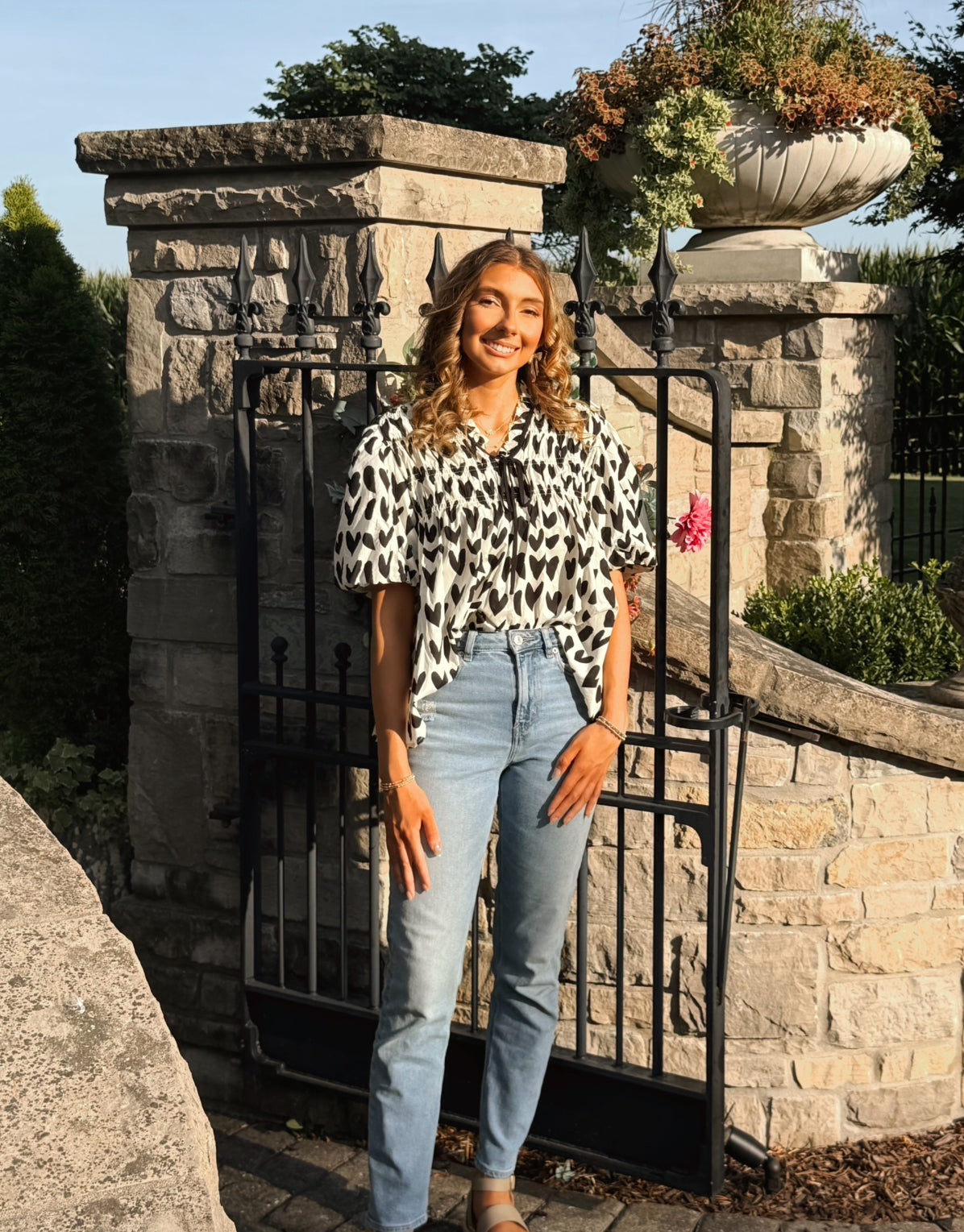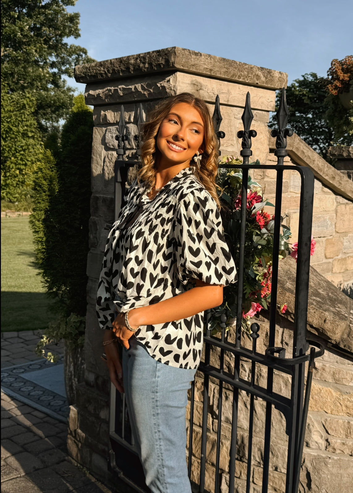 Bold, flirty, and full of charm. The Midnight Romance Blouse is the statement top your wardrobe’s been waiting for. With an allover black heart print on a soft ivory background, this flowy button-up brings a touch of sweetness to any outfit. The relaxed fit and fluttery short sleeves keep it comfy and cute for all-day wear.