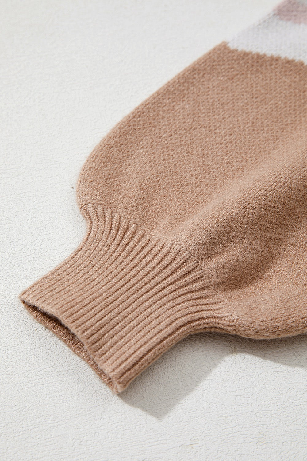 Bring a bold touch of cozy chic to your Winter Blush Collection with the Winter Wildcat Sweater. This soft knit features a striking mix of taupe, cream, and blush with a leopard pattern across the top and sleeves. The chevron color-block design flatters the silhouette, while the relaxed fit and ribbed details make it effortlessly comfortable. Perfect for pairing with denim for a stylish winter everyday look.
